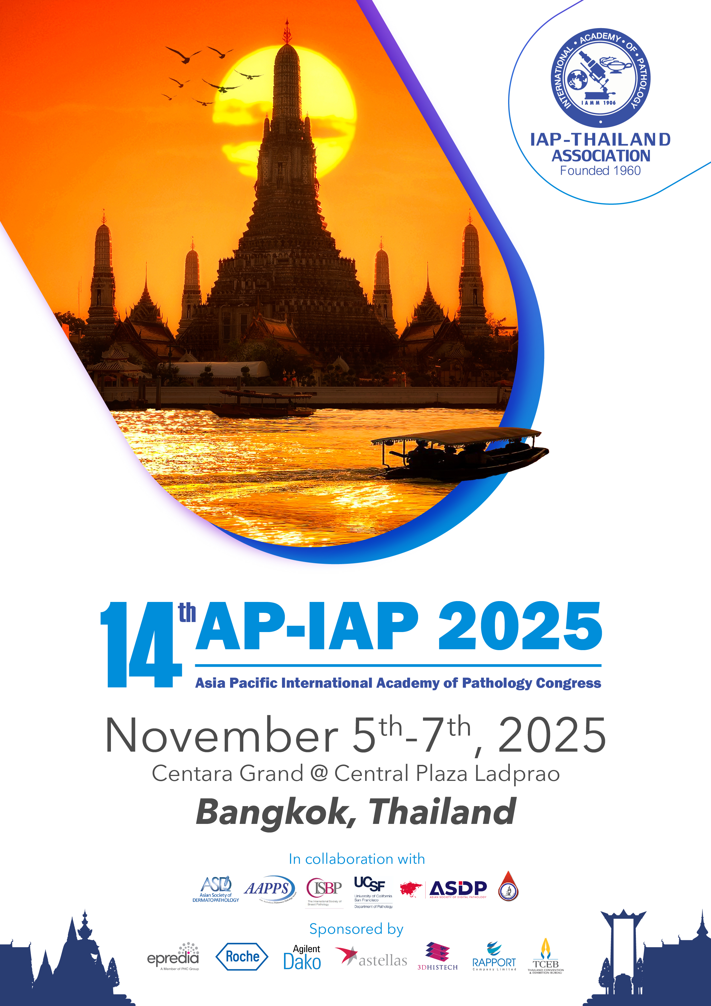 Note: After getting notification of acceptance in late September, the presenting author must register to the meeting and submit the presentation material (PDF file) to presentation@iapthailand.com by 20 October 2024. Otherwise, the abstract will be excluded from the scientific program and publication in a supplement of Asian Archives of Pathology, the official journal of the Royal College of Pathologists of Thailand.